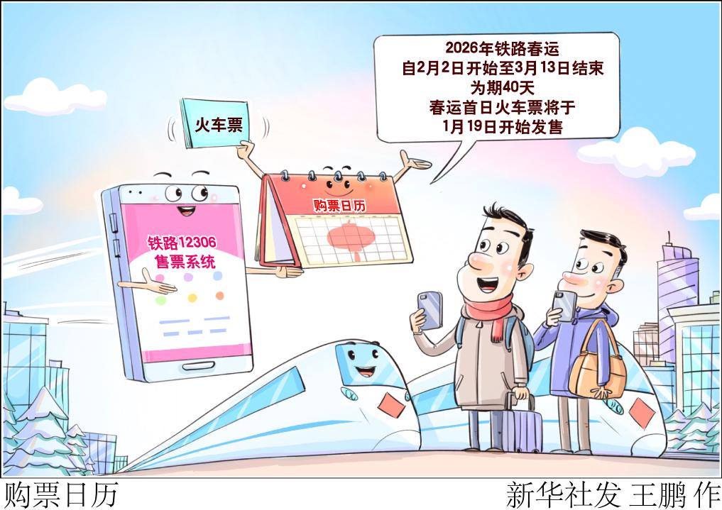 记者1月18日从中国国家铁路集团有限公司获悉,2026年铁路春运自2月2日开始,至3月13日结束,为期40天,全国铁路预计发送旅客5.39亿人次,节前客流高峰日预计为2月13日(腊月廿六),节后客流高峰日预计为2月23日(正月初七),春运首日火车票将于1月19日开始发售。