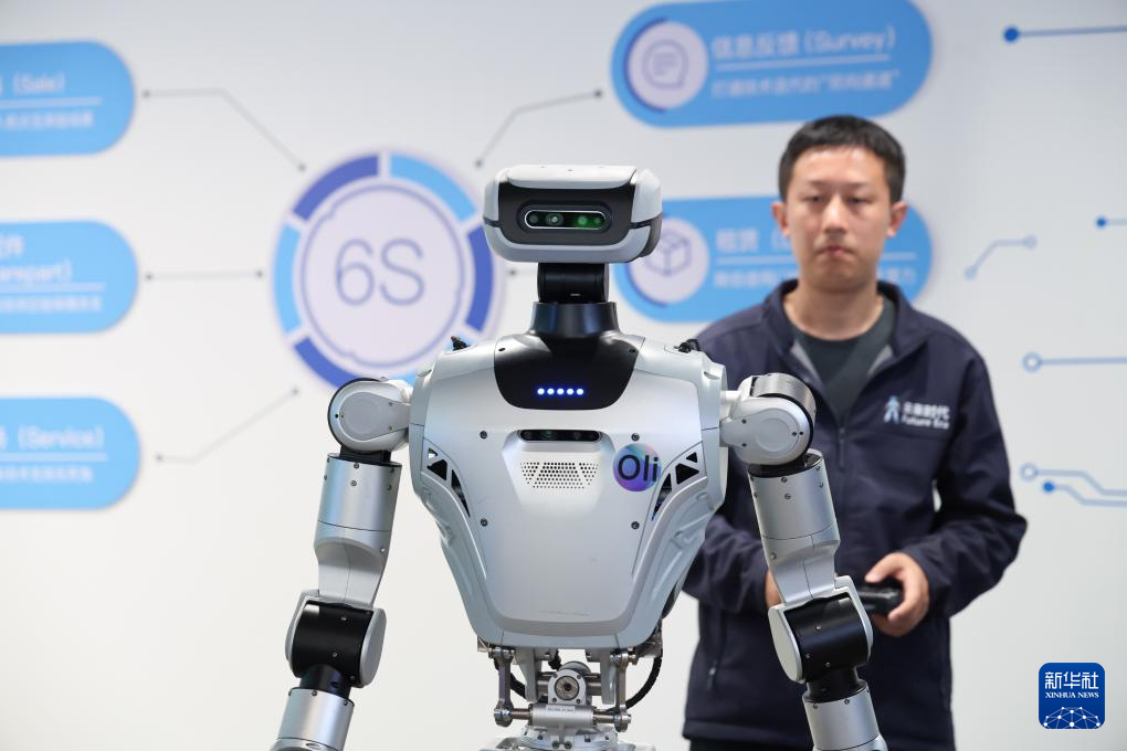 1月16日,在位于深圳市龙岗区的全球首家机器人6S店,工作人员展示一款具身机器人。新华社记者 梁旭 摄