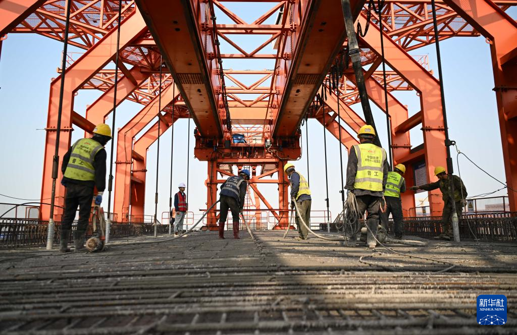 1月28日,在东莞市滨海湾新区的深江铁路跨沿江高速特大桥施工现场,中铁十一局工人在进行浇筑工作。新华社记者 邓华 摄